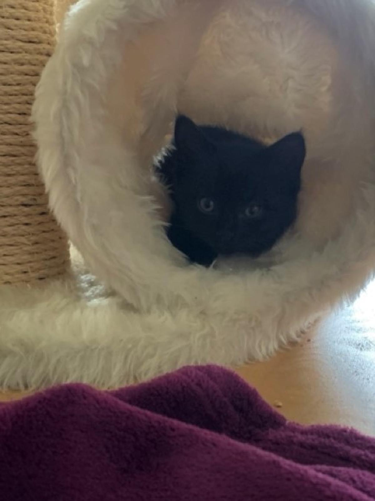Wenn man das Katzenzimmer betritt, oder bei lauten Geräuschen, flitzt Mia meistens noch in eines ihrer Verstecke. Nach wenigen Minuten streckt sie dann aber schon wieder neugierig ihre Nase hervor.