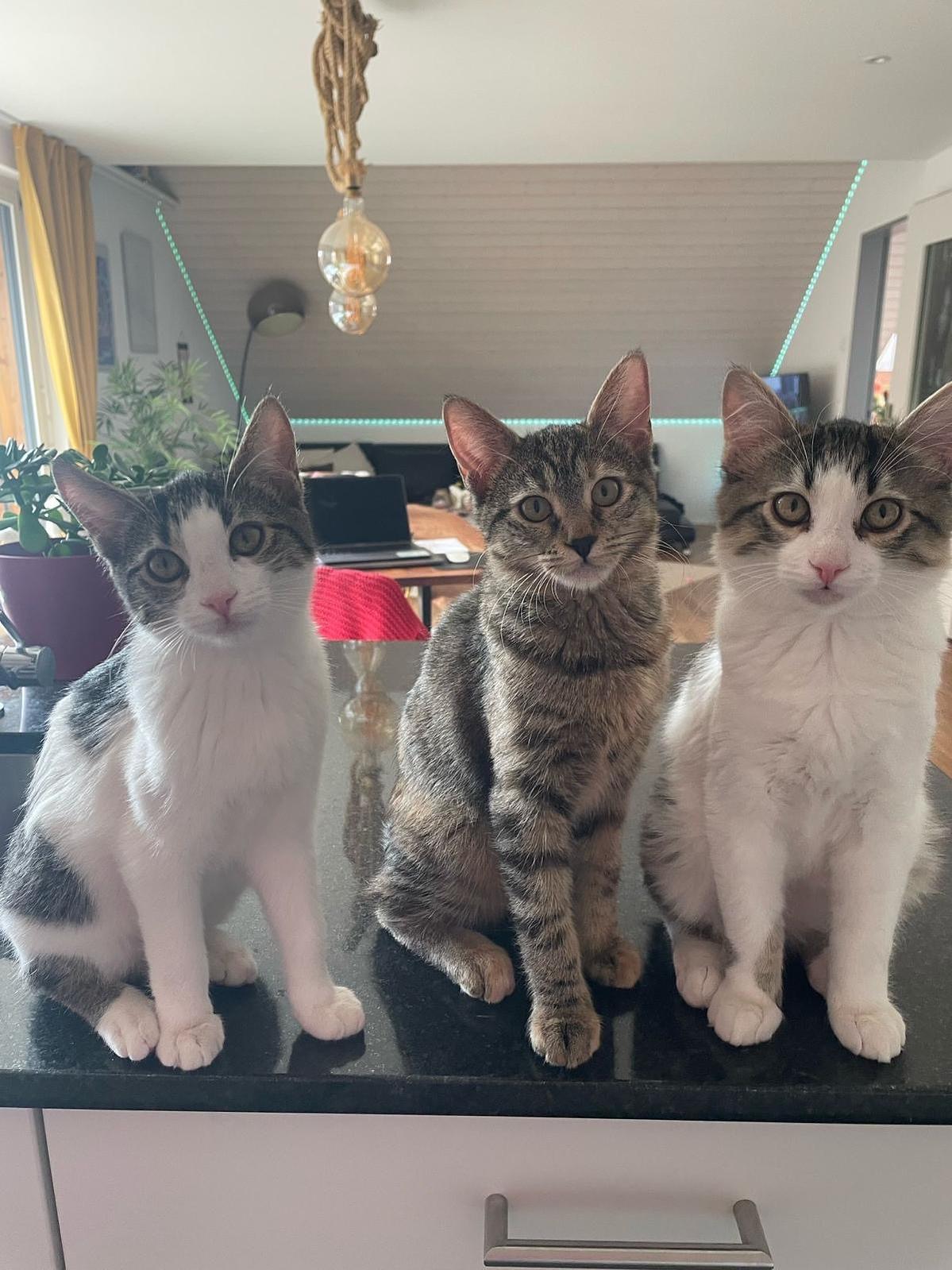 Oh, Lebensglück Nr. 3 – bitte werde wahr für uns Liliput (so nennen uns unsere Fans). Wir hatten bei der Rettung als kleine Babys das unfassbar grosse Glück Nr. 1: Denn Feuermänner auf Santorini (GR) retteten uns aus einem Spalt zwischen 2 Häusern. Sie mussten gar eine Wand zertrümmern. Eine australische Helferin auf 3Mt.-Einsatz für viel Hunde- & Esel-Hilfe vor Ort wurde dann unsere erste, wundervolle liebe Mami und gab uns noch das Fläschchen. Sie wechselte sich ab mit unserer Angel Mama vor Ort, welche uns nach ihrem Arbeitsschluss nach Mitternacht abholte, fütterte, verschmuste und verwöhnte. Am späten Vormittag durften wir wieder zu Sandy, unserer Tagesmami. Wir sind also bereits seit der Rettung sehr reiseerfahren, lieben verschiedene wundervolle Eltern und lassen uns nicht so schnell aus der Teenager-Ruhe bringen.-) Unser grosses Urvertrauen half uns dann auch im Frühling, als auf Santorini die Erde tausende Male bebte. Für unsere Angel Mama waren die Wochen unfassbar sorgenvoll. Oft übernachteten wir alle gemeinsam im Auto, vor lauter Angst wegen Einsturzgefahr. Dann wurde für uns Liliput das grosse Glück Nr. 2 wahr. Wir durften in die Schweiz fliegen, zu einer herzensguten Pflegemami. Aber sie hatte auch einen sehr grossen Hund und nur 2 von uns waren mit ihm happy. Also suchten und fanden unsere treuen Liliput-Fans fürsorgliche Traum Pflegeeltern im Aargau. Dort warten wir nun freudig auf das grosse Glück Nr. 3: Unser Lebensplatz-Glück. Vielleicht wird es mit und DANK DIR bald wahr? So hoffen wir aus ganzem Herzen, dass Du uns HIER siehst und wir Dich berühren. Wir freuen uns so sehr, wenn Du zum Beschnuppern kämst. Dafür und für all Deine Fragen steht Dir unsere liebe Katzensekretärin gerne zur Verfügung. Bitte kontaktiere Sie für uns Liliput, wenn Dich ganz liebe, bescheidene und unkomplizierte Wohnungskatzen glücklich machen dürfen. Wir hoffen von ganzem Herzen, dass Du wie unsere Sprungbretteltern einen ausbüxsicheren Balkon hast: Oh, dann müssen wir uns bitte kennenlernen und beschnuppern. Wir Liliput – die Schwesterleins Aeolia & Anais & Brüderlein Aslan – freuen uns sehr auf DICH. Wir können in bei unseren Pflegeeltern in Lenzburg AG beschnuppert werden.