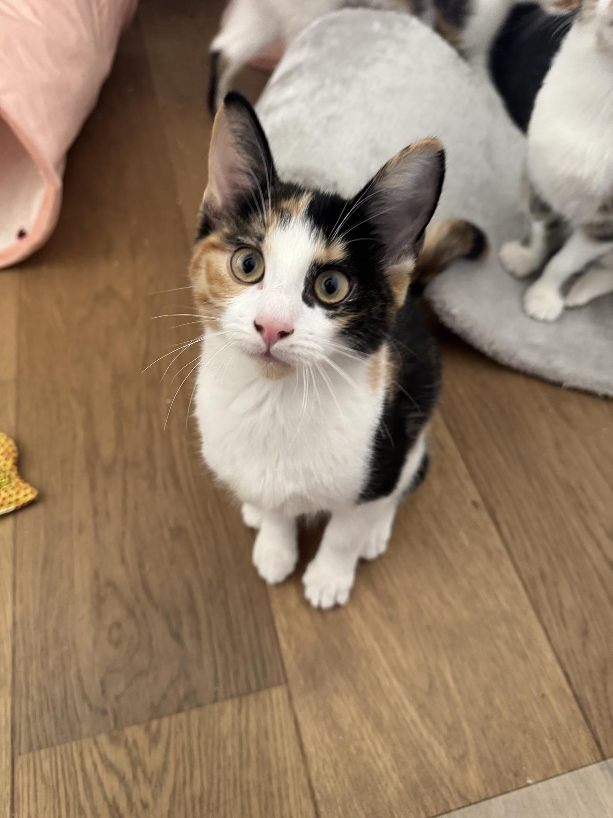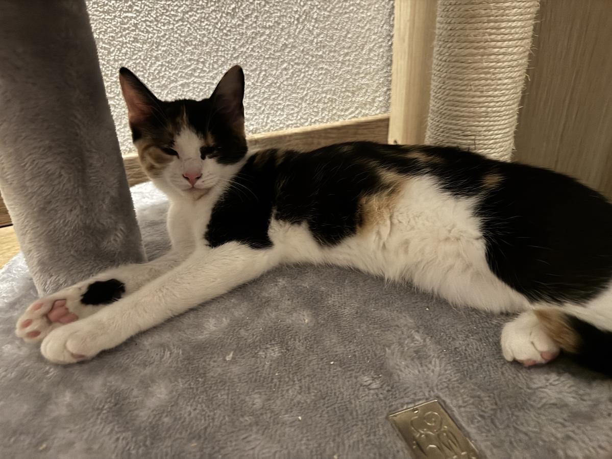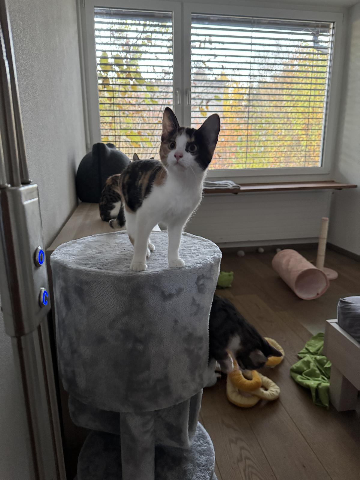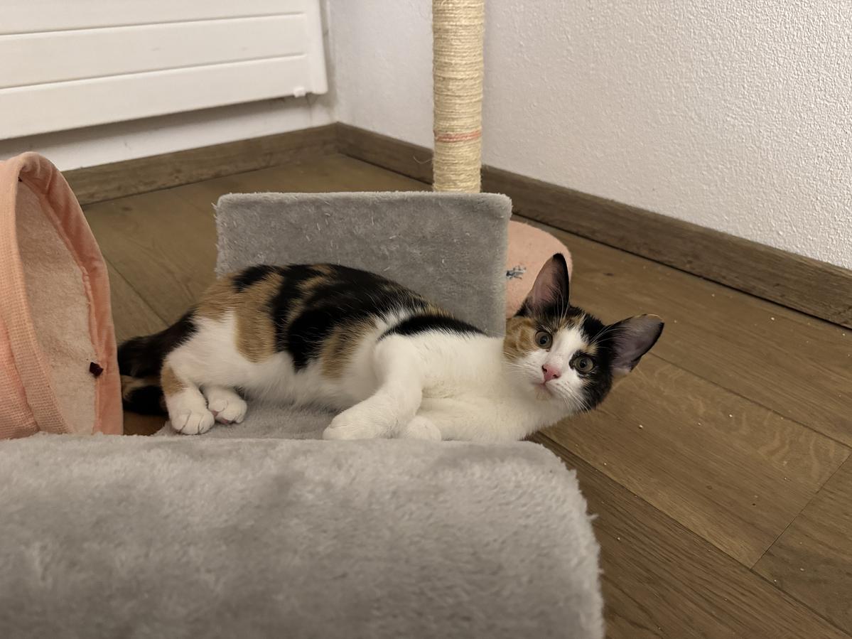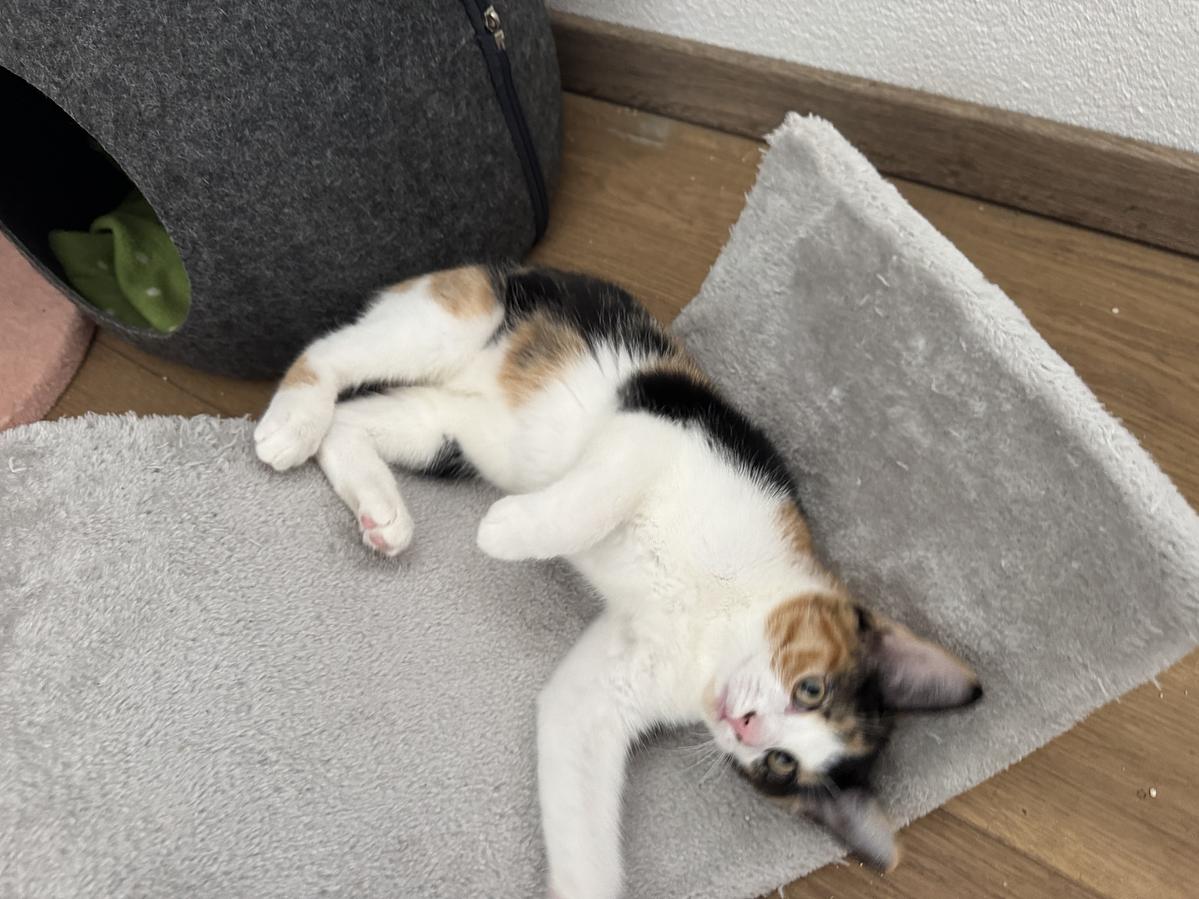 Wie auch ihre Geschwister ist Biene dem Alter entsprechend sehr verspielt. Jagen sich oft gegenseitig umher, spiel-kämpfen miteinander. Sie kann gar nicht genug davon kriegen, wenn man ihr Aufmerksamkeit schenkt und mit Spielzeugen mit ihr spielt.
