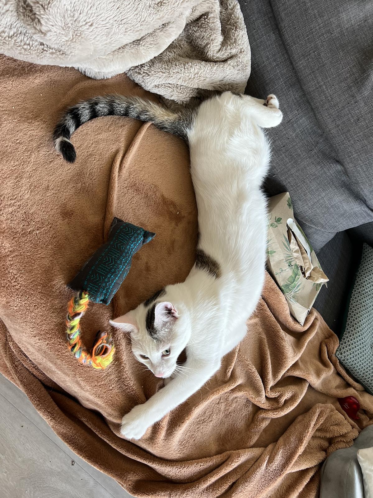 Die Kitten sind von einer wilden Mutterkatze von einem Bauernhof. Die Mutterkatze konnte eingefangen werden und wurde kastriert. Die Kitten hat eine Tierfreundin eingefangen und wurden dann geschöppelt, da die Mutterkatze sie nach der Kastration nicht mehr annehmen wollte. Der Heustock war zudem viel zu gefährlich, so wurden die Kitten aufgepäppelt und uns zur Vermittlung übergeben.