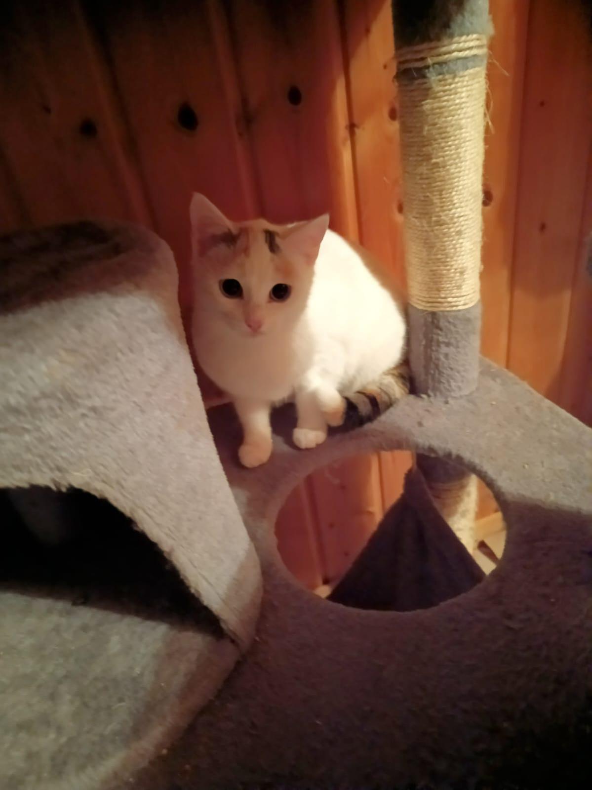Eine Bewegung von mir in ihrer Nähe reicht, dass sie auf die Kratzbäume flüchtet und mit Abstand beobachtet was geht.