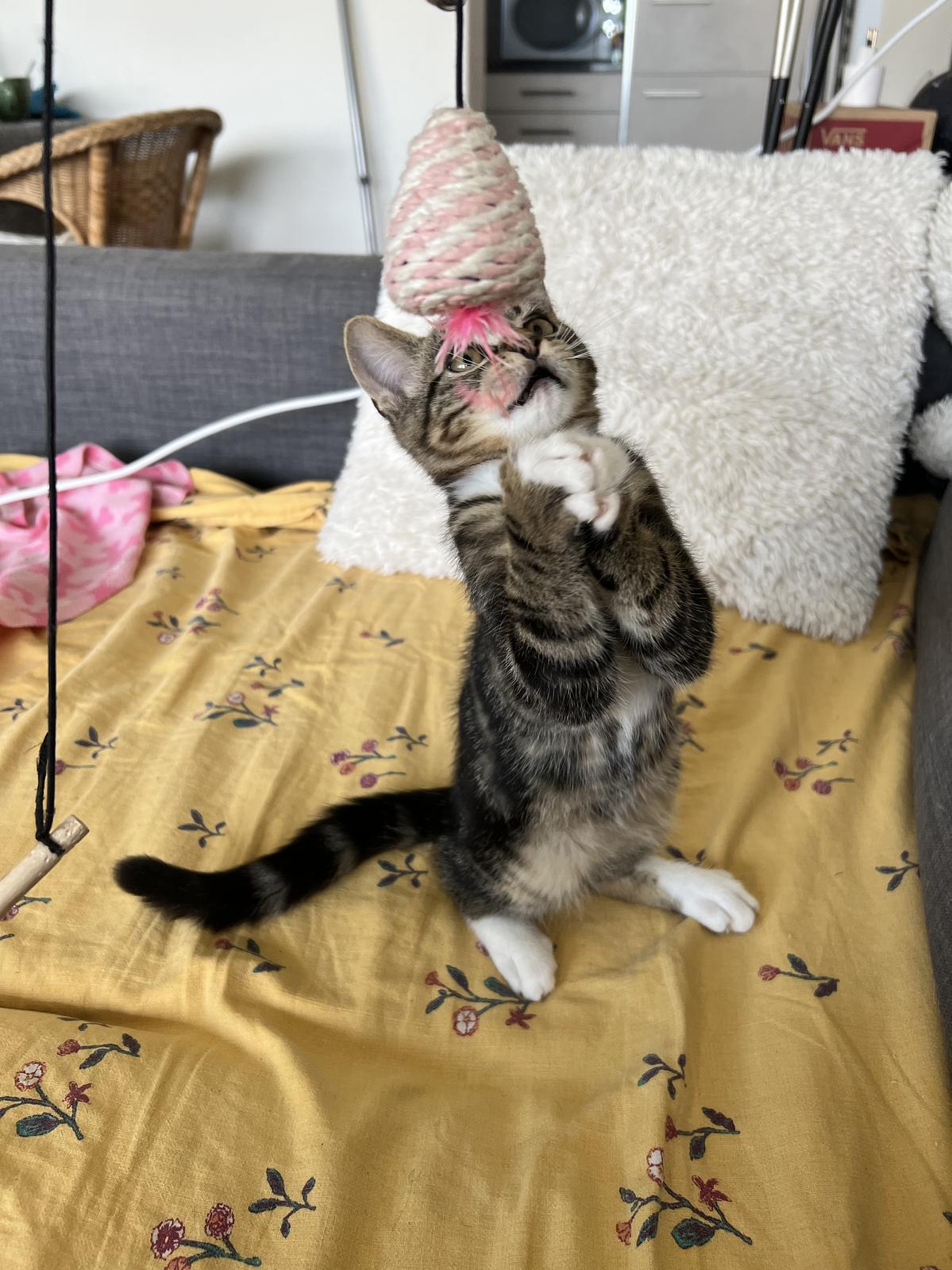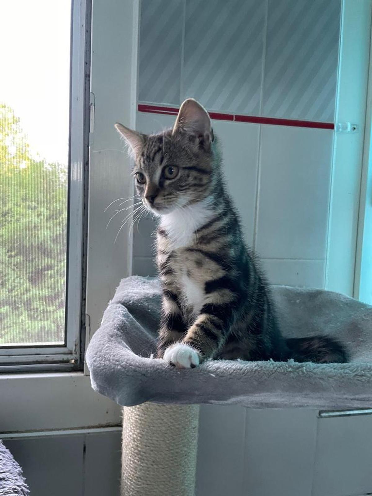 Hermes ist ein richtiges Energiebündel. Er ist super verschmust, redselig und sehr sozial. Er liebt es gestreichelt zu werden und ist der Erste, der aus dem Käfig ausbricht. Hermes rennt jedoch ohne links oder rechts zu schauen, deswegen wäre ein Zuhause mit gesichertem Balkon oder bei Freigang eine sehr ruhige Ortschaft am besten für ihn geeignet.