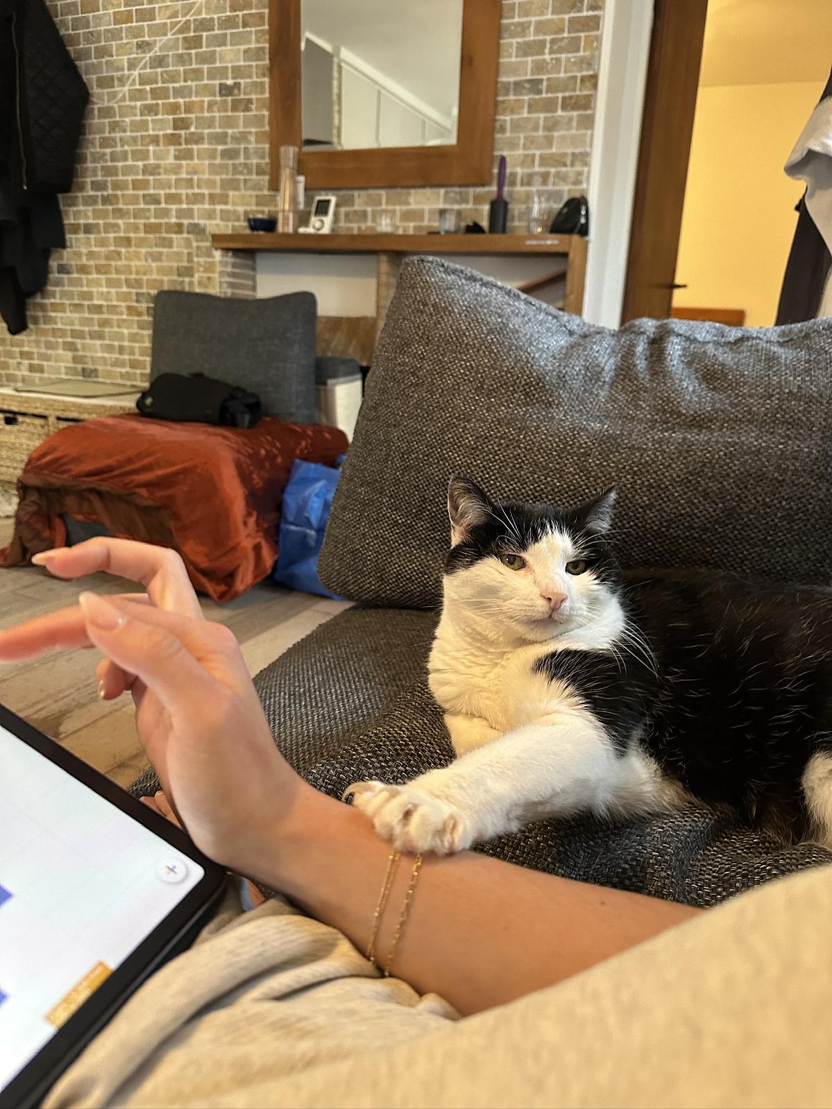 Kikou ist anfangs etwas vorsichtig. Sie mag es nicht so gerne, hochgehoben oder zu viel angefasst zu werden, kommt aber von selbst, wenn sie bereit ist. Dann kuschelt sie sich neben einen, schnurrt laut und sucht Nähe (Sie stupst einen auch an, wenn sie mehr Aufmerksamkeit möchte, wie im Foto zu sehen ist). Sie hat eine sehr eigene, charmante Art – sitzt oft wie ein Mensch auf Stühlen, folgt einem durch die Wohnung und miaut, als würde sie mit einem reden. Trotz ihres Alters spielt sie unglaublich gerne - und zwar am liebsten mit kleinen Papierbällchen.