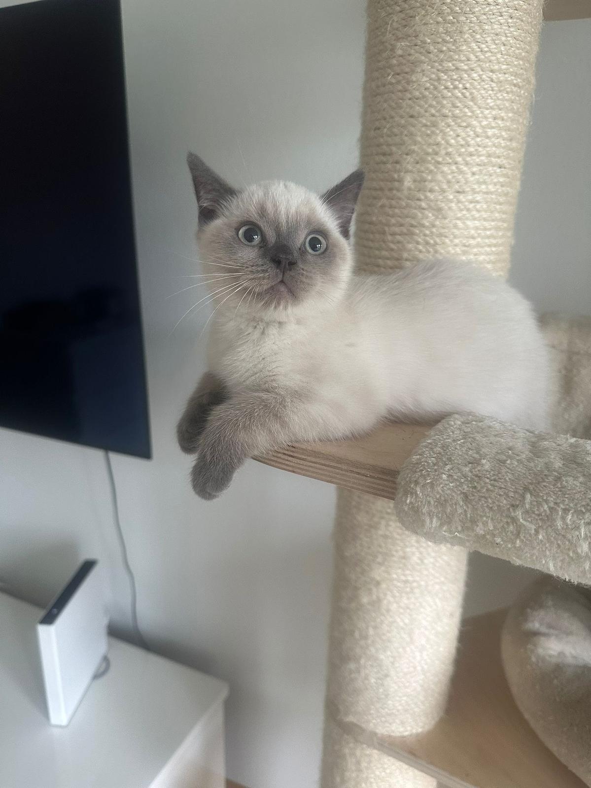 Er hat sich sofort gezeigt und die Nähe zu uns gesucht. Auch das Katzenklo hat er von Anfang benutzt und gut gefressen. Mit Kindern und anderen Katzen geht es ohne Probleme. Mit Hunden ist er noch unsicher und beobachtet dann aus sicherer Höhe auf dem Katzenbaum, das treiben am Boden.