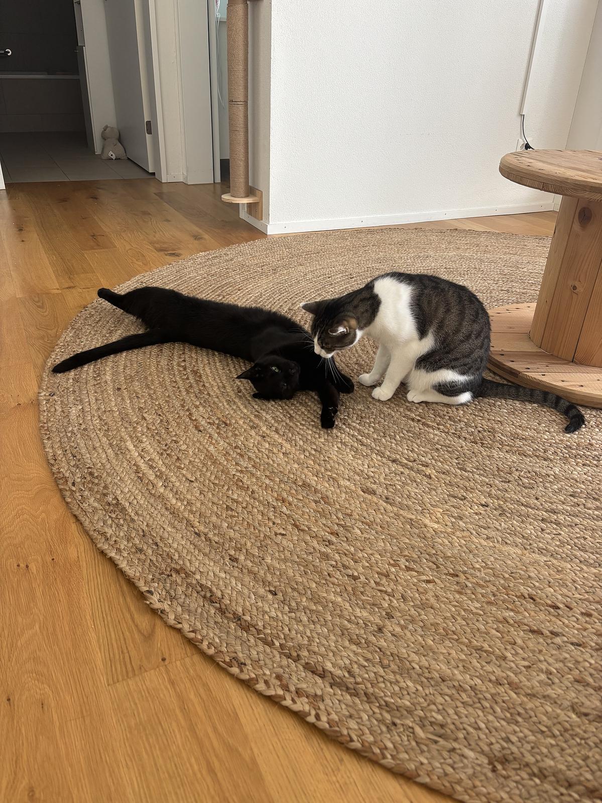 Die beiden sind im Sommer 2022 zu uns gekommen, waren immer stubenrein und sind sehr verschmust und menschenbezogen. Leider hat einer der beiden eine Blasenentzündung entwickelt, die tierärztlich behandelt wurde. Seitdem zeigt er jedoch wiederholt Markierverhalten in der Wohnung, vermutlich stressbedingt und durch fehlenden Auslauf.