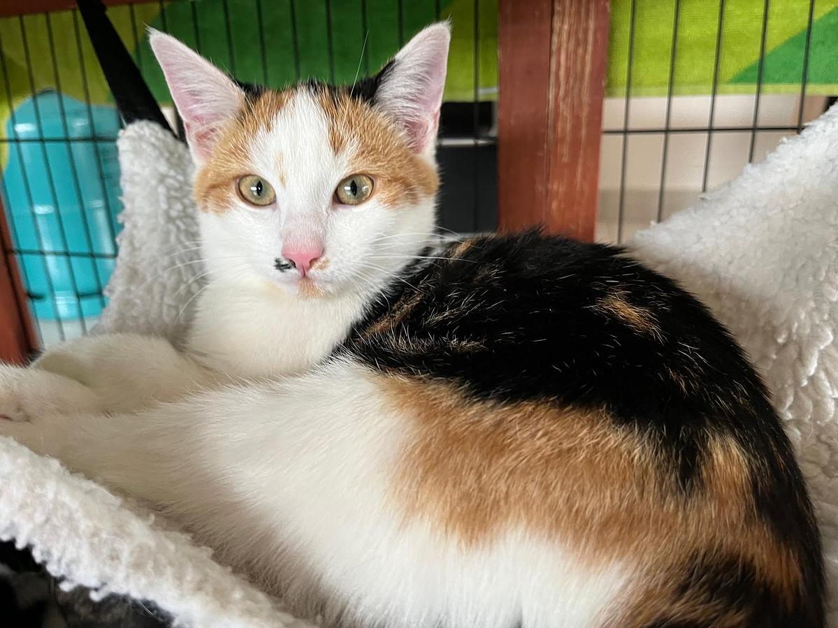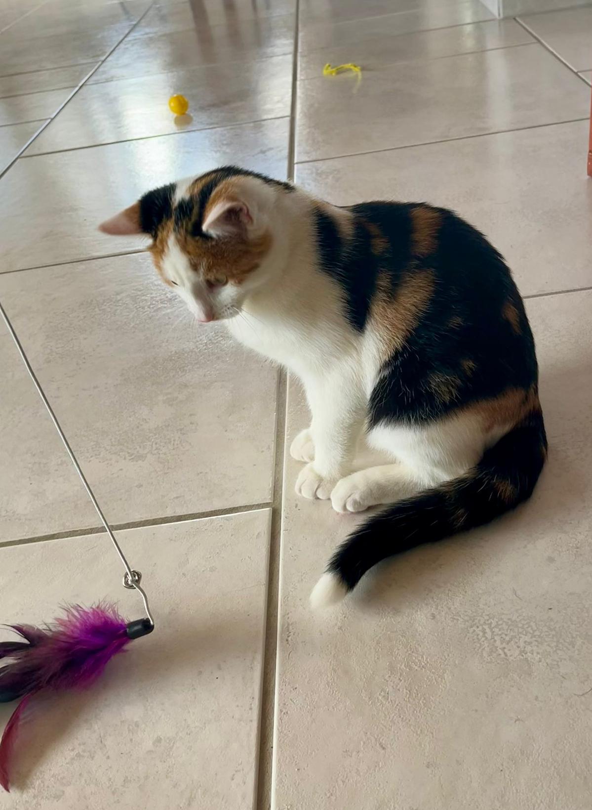 Minza – Die verspielte Schönheit mit den goldenen Augen Die tricolor Katze Minza ist eine echte Augenweide mit ihrem bunten Fell, ihren strahlend goldenen Augen und einer ganz besonderen Zeichnung im Gesicht. Es sieht aus, als hätte sie einen kleinen Schnauz, aber nur auf einer Seite, was sie einfach unverwechselbar macht.