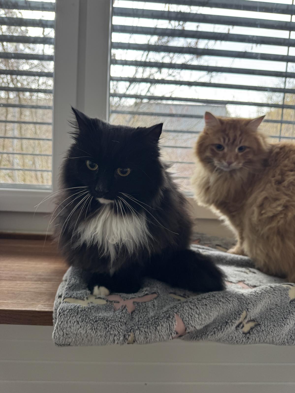 Die Beiden sind zu Beginn noch etwas vorsichtig, aber auch neugierig; dann schnell auch zutraulich, und geniessen menschliche Aufmerksamkeit. Aufgrund des langen, dichten Fells ist bei den beiden regelmässige Fellpflege notwendig (mehrmals wöchentlich bürsten, falls verfilzt schären). Sie scheinen diese Fellpflege jedoch sehr zu geniessen, und danken gerne mit lautem Schnurren. Sie kommen auch gerne von sich aus zu Menschen hin, welchen sie vertrauen; schlafen gerne neben (oder auf) ihnen. Gemäss vorheriger Besitzerin mögen die beiden auch Kinder und geniessen es, mit ihnen zu interagieren.
