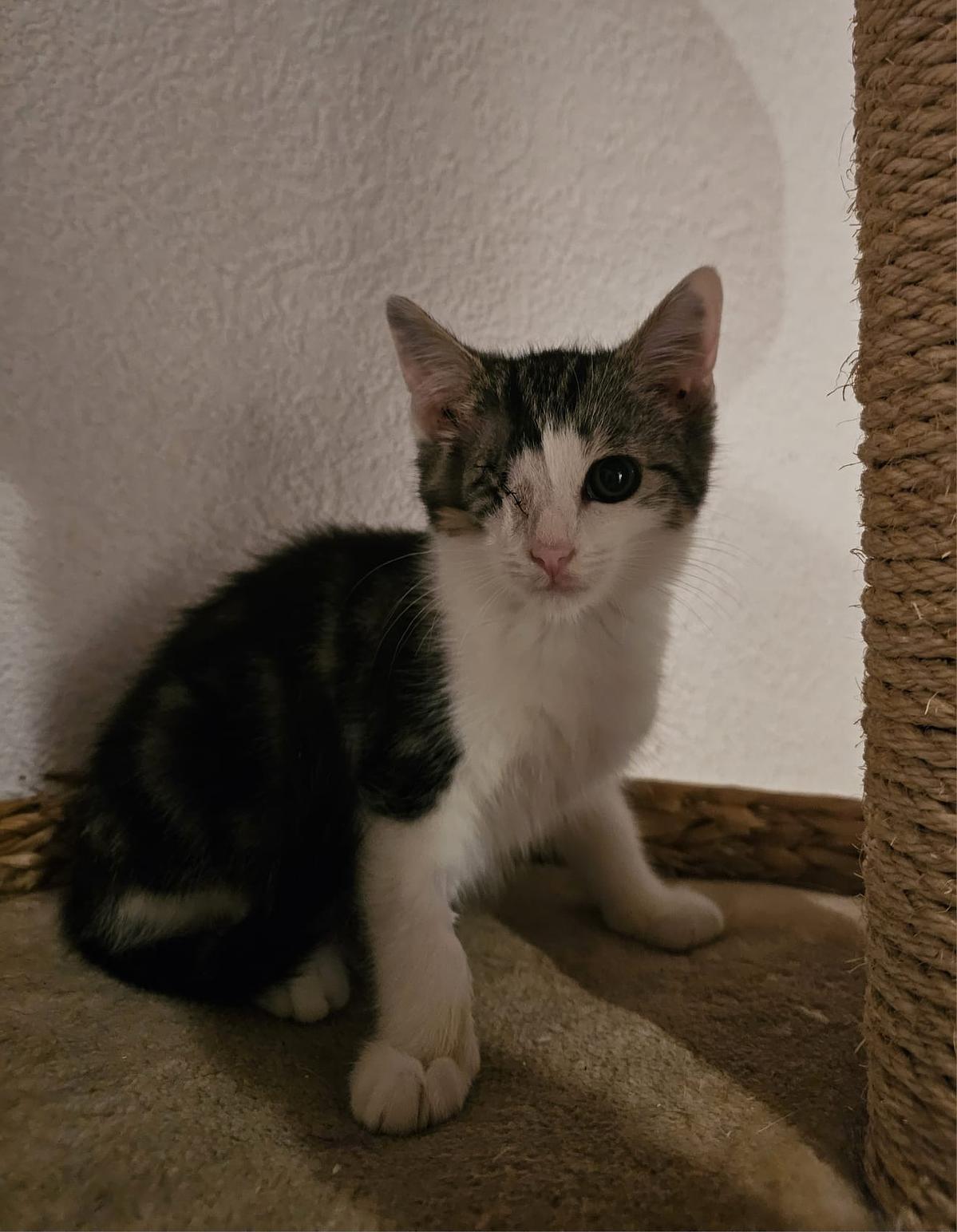 Pepsi kam mit 3 anderen Kitten zu uns. Da er aber viel grösser und schwerer ist als alle anderen, gehen wir davon aus, dass er nicht zum gleichen Wurf gehört. Aber wie Kitten natürlich so sind, kommen sie miteinander aus, als wären sie Geschwister. Pepsi hat ein ganz schlimmes Auge und wir hoffen sehr, dass wir dieses retten können. Noch ist es schlimm entzündet und wird natürlich behandelt und die Daumen sind gedrückt, dass es nicht schon zu spät ist. Pepsi ist zutraulich. Er schnurrt zwar nicht, lässt sich aber ohne Zögern hochheben und sein Auge behandeln und ist dabei ganz tapfer und brav.