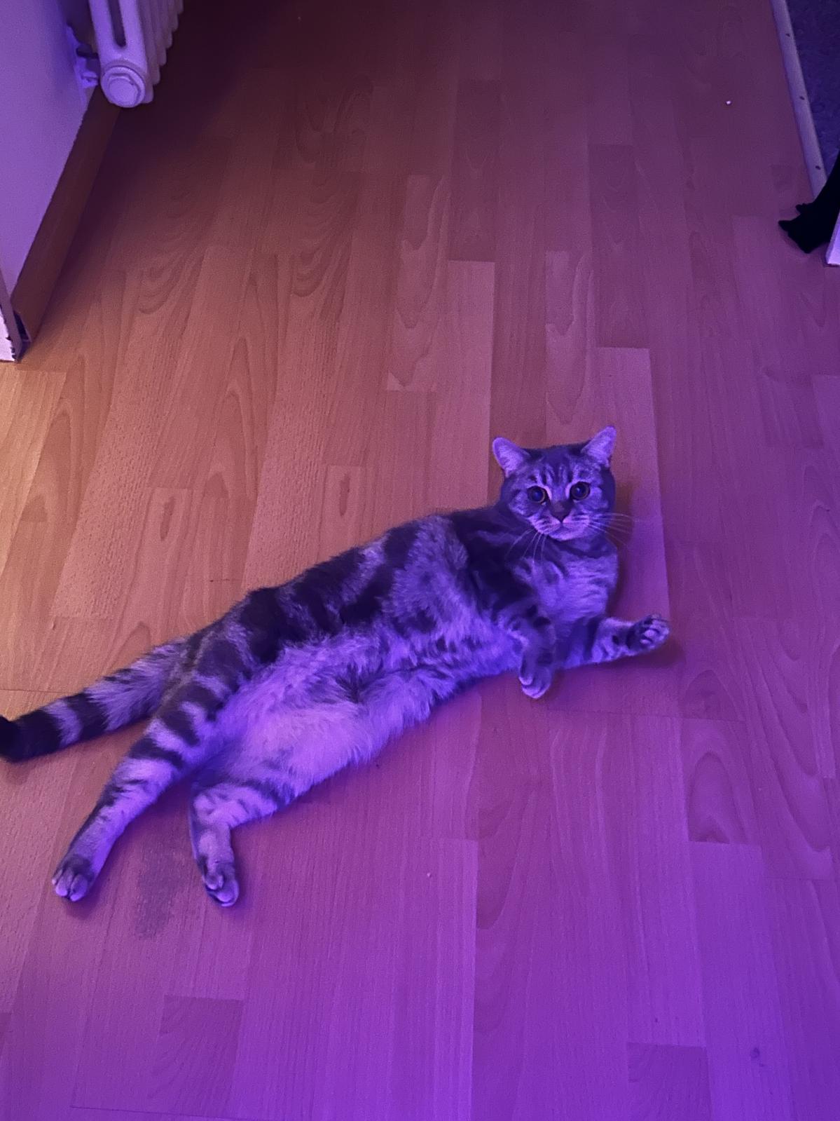 Die Katze ist sehr verspielt, spielt gerne mit verschiedenen Dingen, lässt sich gern streicheln, liegt oft neben dir und ist insgesamt sehr freundlich.