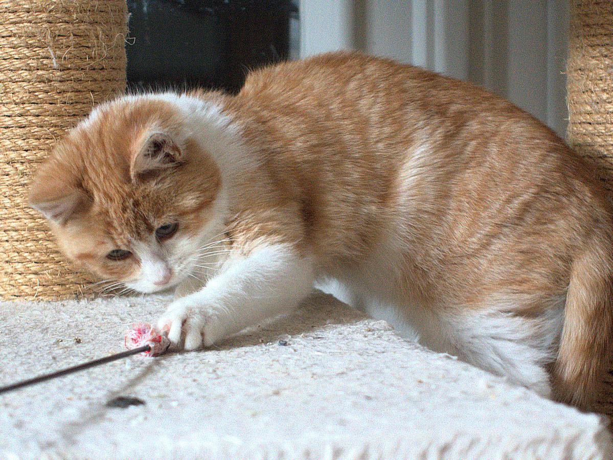 Pistache ist mit Abstand der Mutigste, Neugierigste und Zutraulichste der Geschwister. Er spielt schon sehr gern mit Angeln und anderen Spielsachen, der menschlichen Hand vertraut er aber noch nicht.