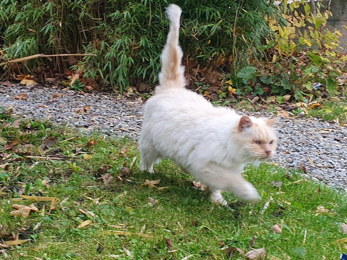 Sehr, sehr lieb, treu und anhänglich – ein Kuschel-Büsi, das sehr gerne auf Menschen ausgerichtet ist. Er hat hat ein chronisch entzündetes Auge, das nur halb sichtbar ist. Darum braucht er ab und zu Antibiotika. Unser Tierarzt versichert uns, dass der Kater insgesamt wohlauf ist. Da er ein Mischling ist mit langem Fell braucht er mehr Fellpflege als eine Kurzhaar-Katze. Wir scheren sein Fell regelmässig mit einer kleinen Hundeschermaschine und erstaunlicherweise liebt er auch das und hält gerne hin. Rasta fängt keine Vögel und Mäuse, klettert auch nicht auf Bäume oder rennt nicht auf die Strasse, weil er mit dem einen Auge vermutlich nicht so gut sieht. Vielleicht ist er auch einfach mit seinem Garten zufrieden. Es liebt die Kindern vom Schulhaus nebenan, die ihn oft streicheln.